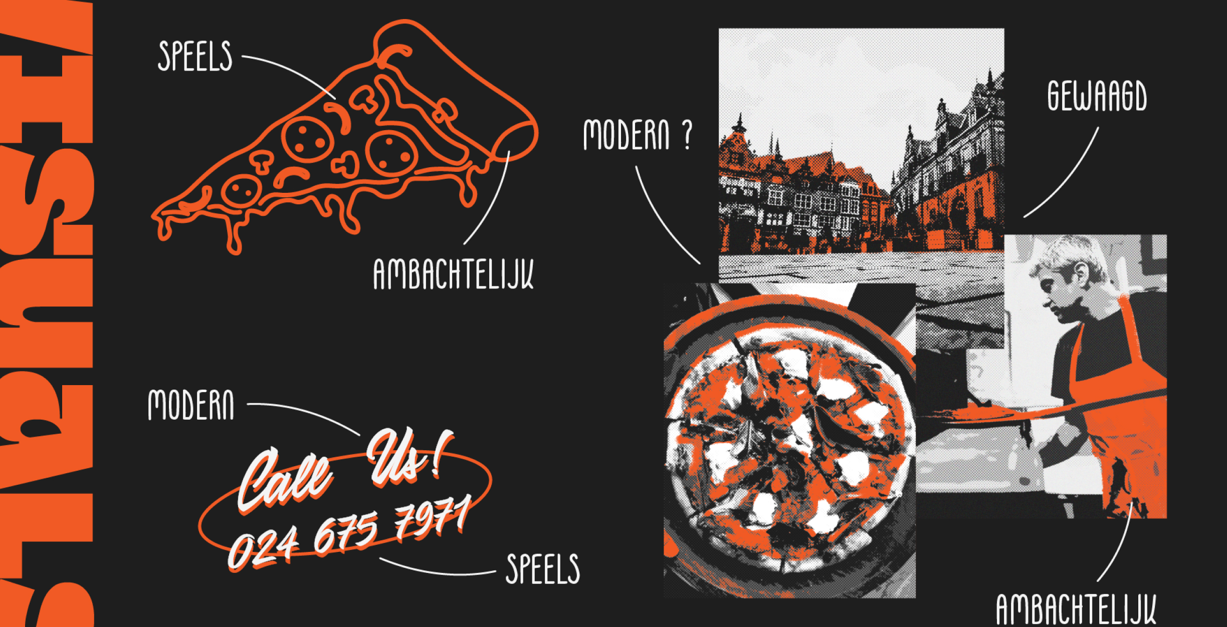 The client is in the process of opening their own pizzeria in Nijmegen. A rustic building has already been secured by the Waal river. Visitors will soon be able to enjoy delicious pizzas on the 'Pizza Terrace,' accompanied by a beer or soft drink. The pizzas will be made with bold ingredients instead of the traditional Italian ones. The only thing the client was still missing is the branding for Mr. Dough.
